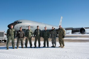The Flight Crew of a KC-135R Stratotanker, tail number 58-0104, from the 157th Air Refueling Wing, New Hampshire Air National Guard, pose for a group photo prior to flying the aircraft to the 126th ARW, Scott Air Force Base, Illinois, Jan. 30, 2019. From left, Tech. Sgt. Mark Brophy, Master Sgt.